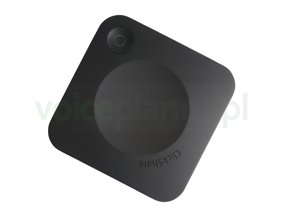 | Zasięg | Regulowany z modulacją siły sygnału; maks. 30 m (100 stóp) między ClickShare Button a ClickShare Base Unit Pasmo częstotliwości 2,4 GHz i 5 GHz (DFS) |
