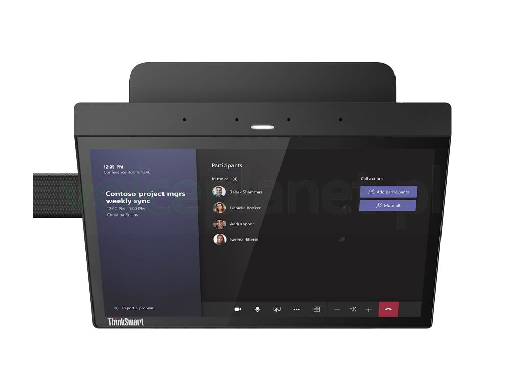 Teraz nie umknie Ci żadne słowo — ThinkSmart Hub ma cztery wysokiej klasy, pełnodupleksowe głośniki o mocy 3 W oraz cztery mikrofony w podwójnych konfiguracjach, dzięki którym sala spotkań i pomieszczenia uczestników zdalnych wypełnią się krystalicznie czystym dźwiękiem. Antyodblaskowy wyświetlacz o przekątnej 10,1” i odporny na zabrudzenia ma rozdzielczość FHD (1920 x 1200) oraz jasność 320 nitów. Urządzenie zajmuje minimum miejsca, a mechanizm z pojedynczym przewodem pomaga w zachowaniu porządku.